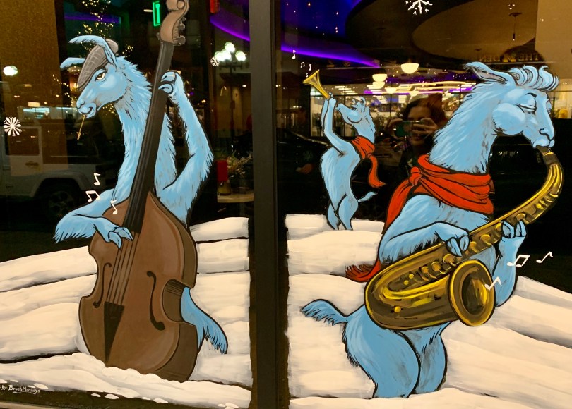 A and I are officially in the throes of cabin fever, and when our beloved Midnight Madness rolled around, she decided that we needed to mix things up and elected to check out a jazz club downtown that we had never visited. Our friend Julia was with us and her mom was in town from the East Coast, so A thought we’d show them a sophisticated time . . . after visiting the holiday petting zoo, of course, and making a quick stop in the Himalayan Bazaar to see if the Yeti was around—he was not, because he never is, BUT I WILL SEE HIM NEXT YEAR SO HELP ME.