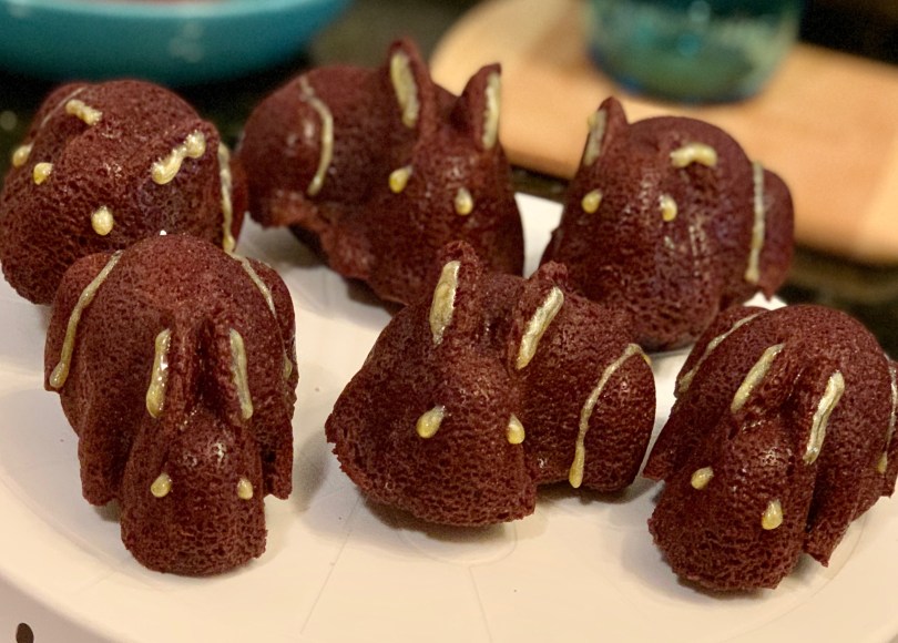 In the spirit of the occasion, I got gold icing gel with SPARKLES so my bunnies would be fit for the big show. And because I made way more batter than I needed, I got three extra bunnies out of the six-bunny mold.