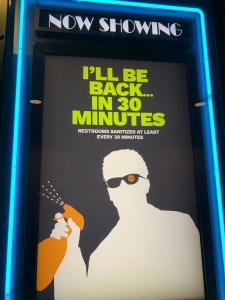 When I got to the multiplex, there were four other cars in the parking lot. I had my ticket on my phone, and scanned it at a machine behind the roped-off concession stand and roped-off arcade games. There was an employee standing by in case anyone needed help: she hesitantly asked me “Do you want a paper ticket? We’re not tearing them anymore.”