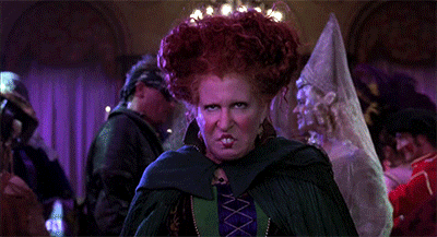 My sister and Stella have been giving me shit all month for not wanting to watch the holiday classic that’s only a classic because it’s been forced upon us, Hocus Pocus. I hate Hocus Pocus for many reasons: the fabulousness of Bette Midler aside, it’s poorly written, terribly paced, an eight-year-old girl fixated on a teenage girl’s rack makes me uncomfortable for a far different reason than it did when I actually was eight (and boy do we not have time to unpack all of that!) and also?