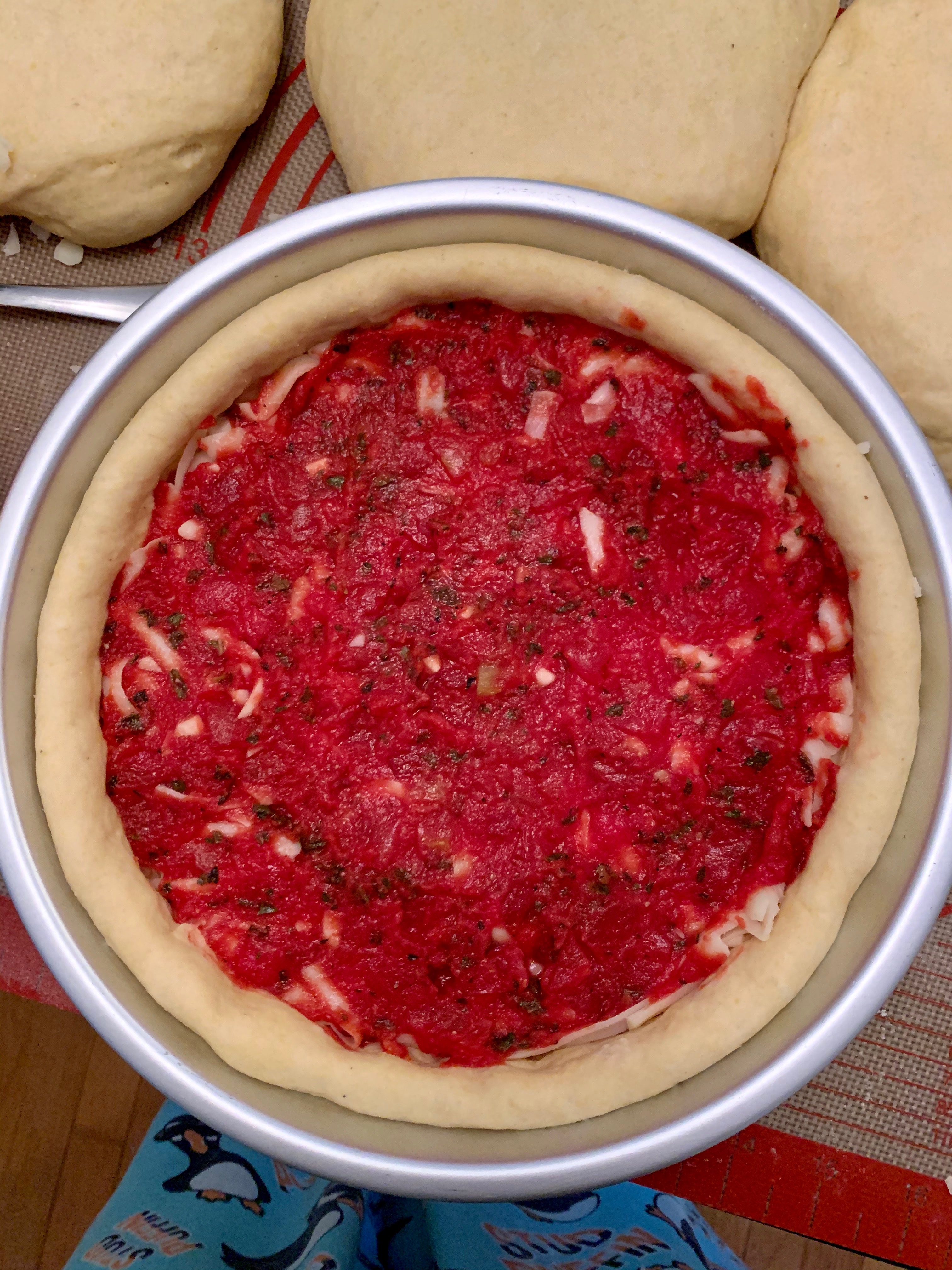 Chicago style deep dish doesn’t have to rest as long since it gets baked in a pan, no stretching required. The doughs are basically the same except the Chicago dough contains cornmeal, to give it a bit more heft so it doesn’t fall apart underneath all those layers.