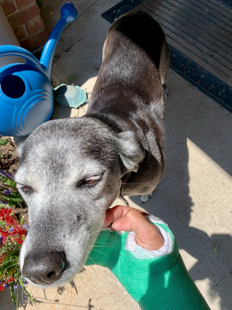 A little girl wearing face paint came up to me to pet Lumi and asked “What’s on your hand?” I explained that I broke my pinky and the cast is keeping it in place while it heals, and she nodded, “I have a butterfly on my face.”