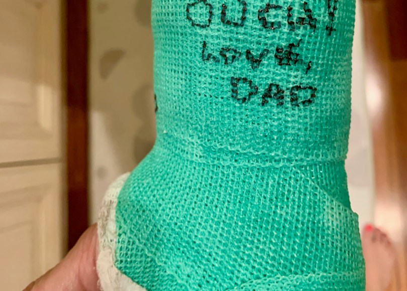 The orthopedist gave me a list of instructions for care of my cast. Number one rule is don’t get it wet, number two is “Do not use your cast as weapon. No hitting your younger siblings.”