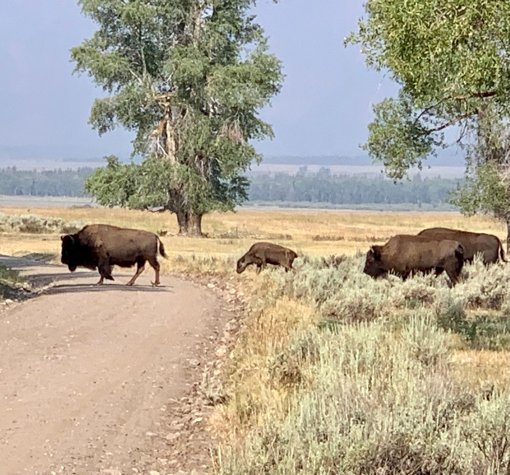 These bison (they’re not really buffalo! Even though we call them that! Because when the Europeans arrived they thought they were looking at buffalo but bison are a completely different thing! And yet the name stuck! It’s just more colonialist bullshit!) weren’t afraid of us either. At the national parks, bison injure three times as many people as bears do. And they can really hurt you—they look slow, but they’re not. The entire herd crossed the road right in front of our car in just a couple of minutes, and they weren’t even running, just sauntering past, like a cave painting in motion.